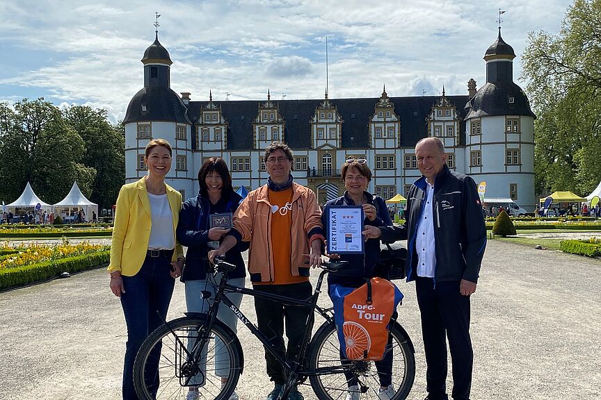 Im Barockgarten des Schloss Neuhaus in Paderborn wurde die Auszeichnung als ADFC-Qualitätsradroute übergeben. Von l. nach r.: Edith Rehmann-Decker, Anja Veith. Andreas K. Bittner, Martina Kocik, Landrat Christoph Rüther © Kreis Paderborn