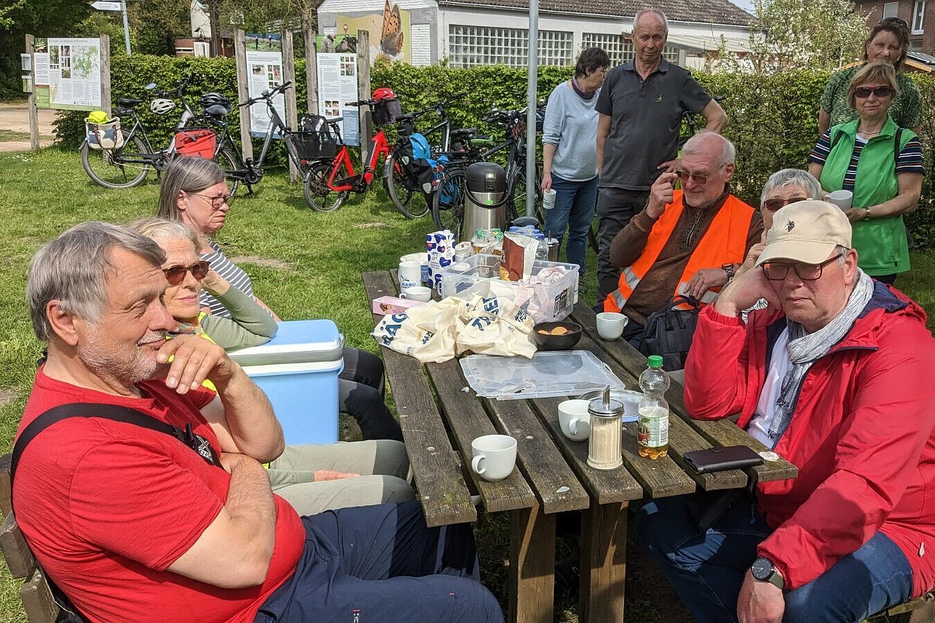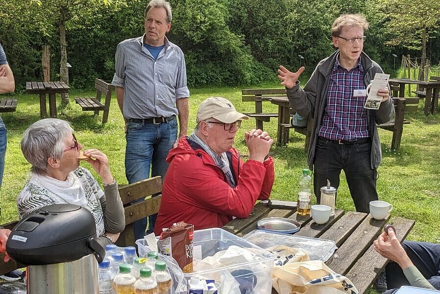 In der NABU Naturschutzstation gab es zuerst eine Stärkung mit Kaffee, Getränken und Süßem. Dabei unterhielt uns Rafael Hildering vom NABU mit vielen Geschichten und Zahlen zur Entstehung und Entwicklung der NABU Naturschutzstation. Allein in den letzten drei Jahren wurden 2,3 Millionen Euro investiert um den schönen Natur- und Kräutergarten, mit den Teichen und den Schafen entstehen zu lassen. Besonders gefiel uns der gelungene Picknickbereich, den wir auch gleich dankbar annahmen. Rafael wurde sogar spontan Mitglied im ADFC und übergab eine unterschriebene Beitrittserklärung. Nach einem Gang über das Gelände, wo jeder nach eigenem Gusto stöbern konnte, ging es dann über Ammelsbüren, Berg-Fidel und dem Sternbusch zurück zum ADFC in die Fitserei.